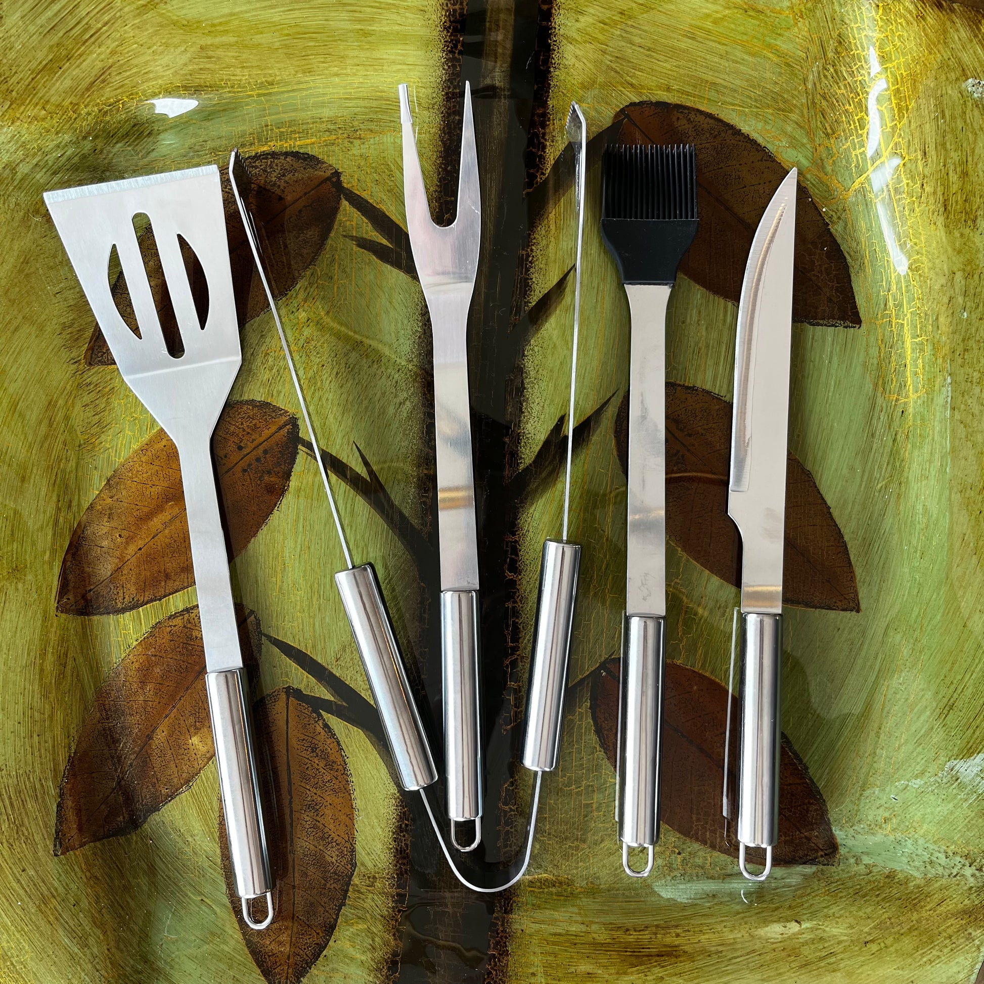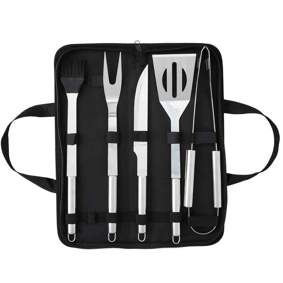 Included: Slotted spatula, BBQ fork, tongs, knife, spatula, basting brush and stainless-steel storage case.