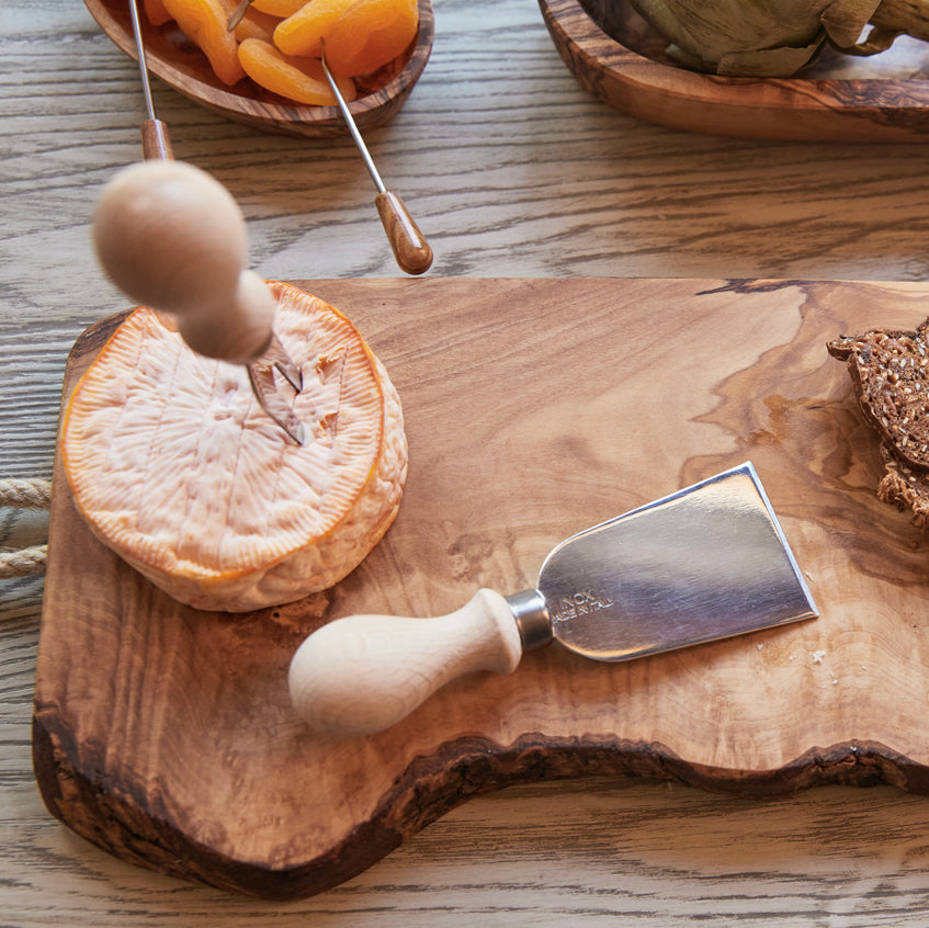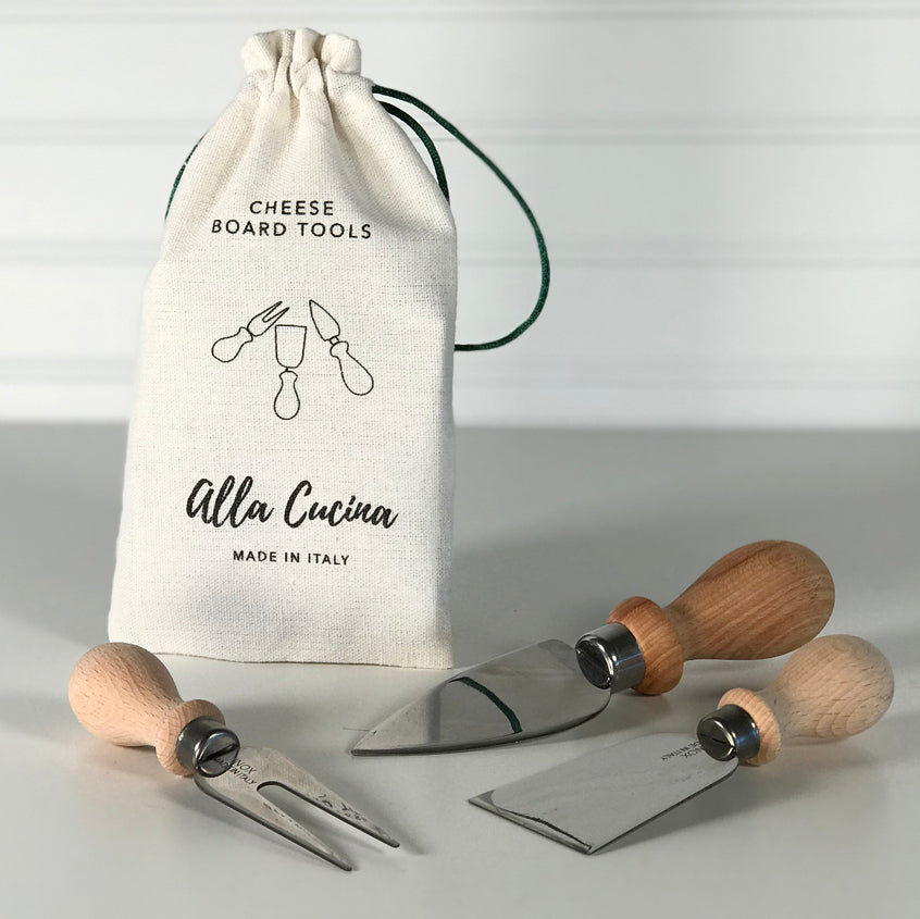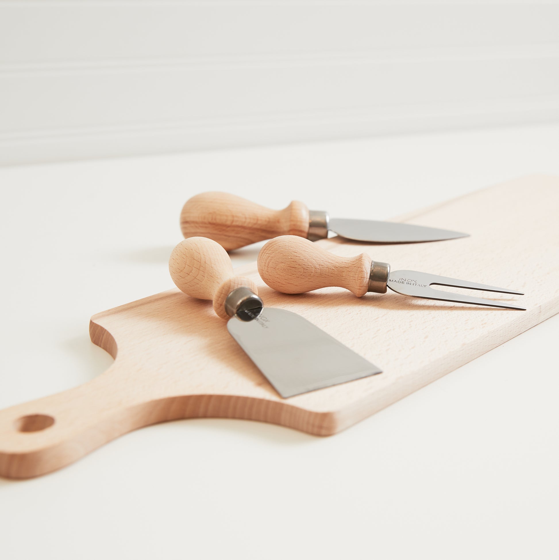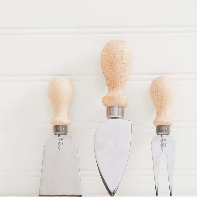 Serve your cheese board in style with our Italian Cheese Knives. Made of beechwood and stainless steel, these little tools are built to last. A stylish way to slice and serve your favorite cheeses. This set of three features a hard cheese knife, soft/medium cheese spatula knife, and a cheese fork; must-have tools for the connoisseur and the everyday cheese fan alike.