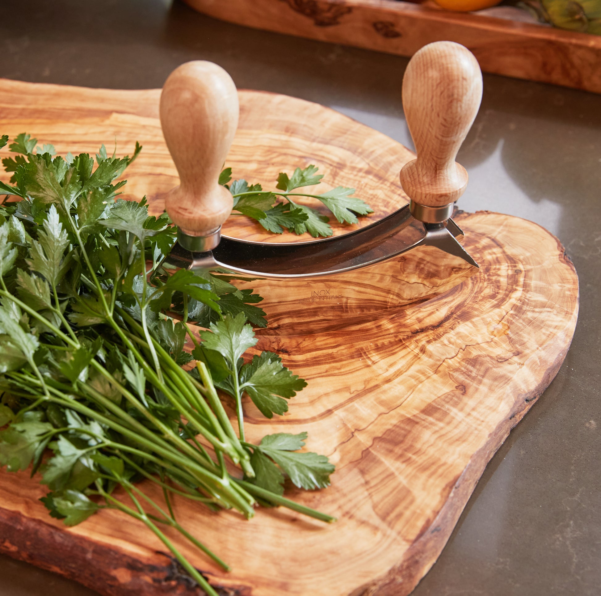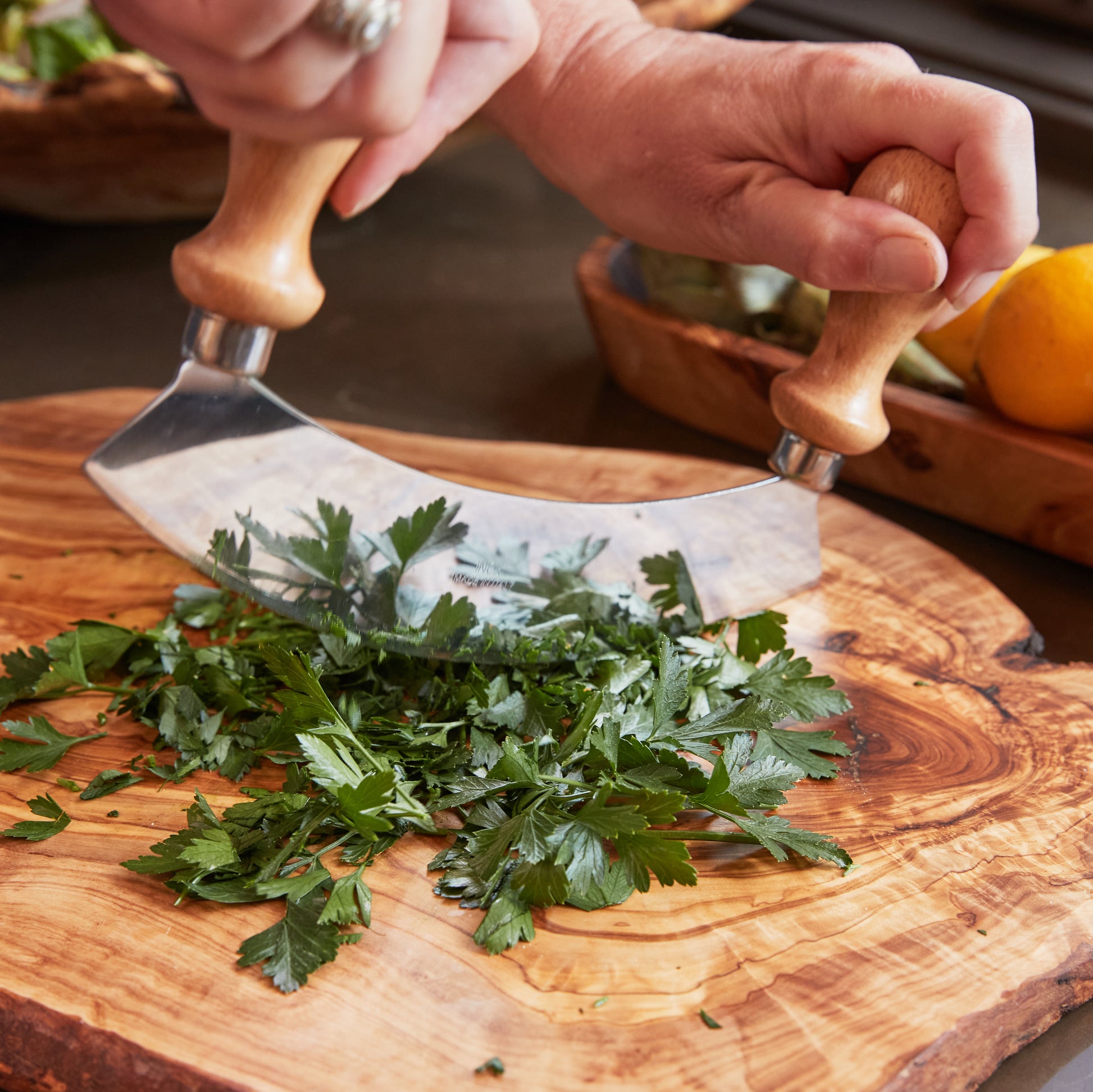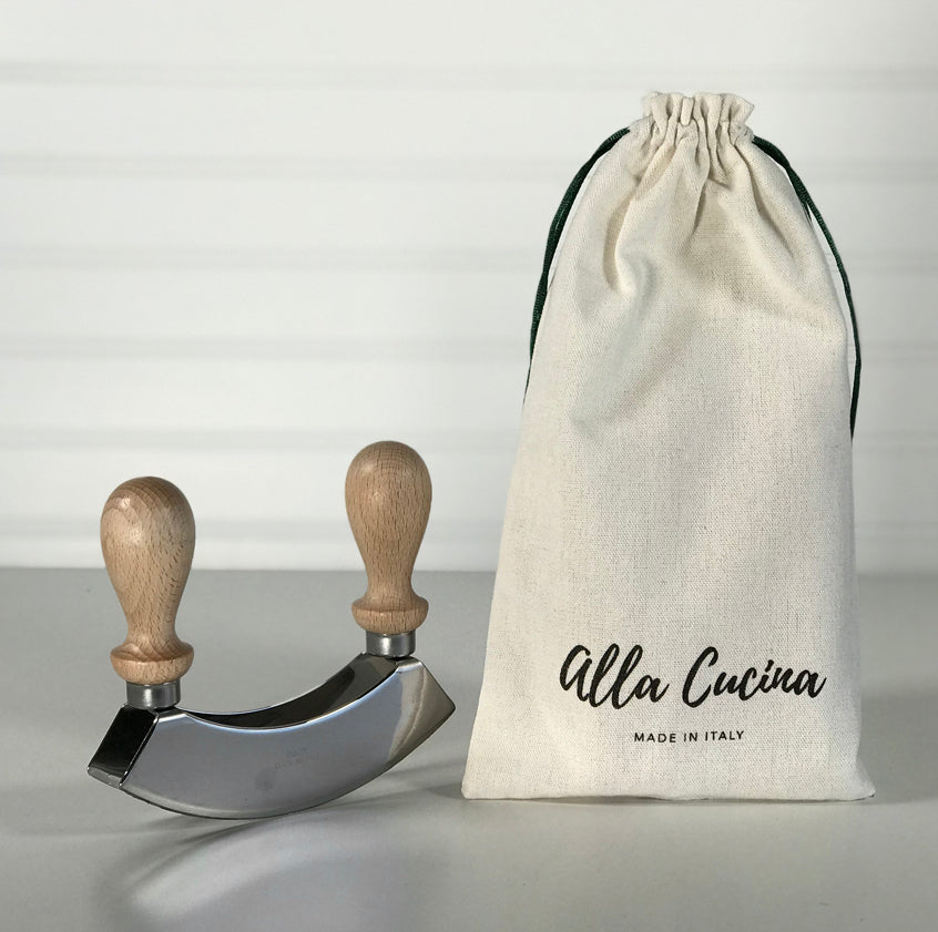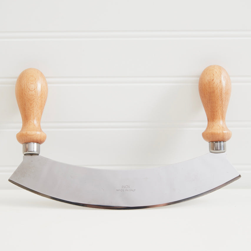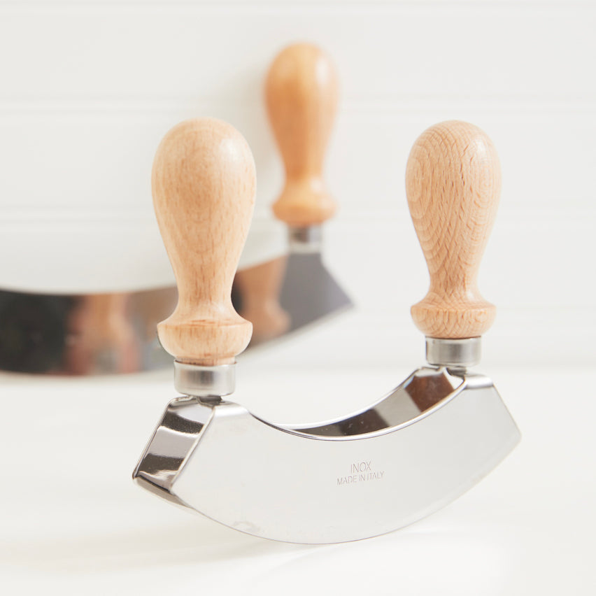 A traditional tool, the Mezzaluna, (meaning “half-moon” in Italian) is a culinary favorite when it comes to quick, efficient chopping. Strong beechwood handles make it easy to grip while keeping hands away from the double blades, used to coarsely mince together herbs, dried fruits, garlic, nuts, olives, salads, and more. Choose from either a single blade, or double blade.